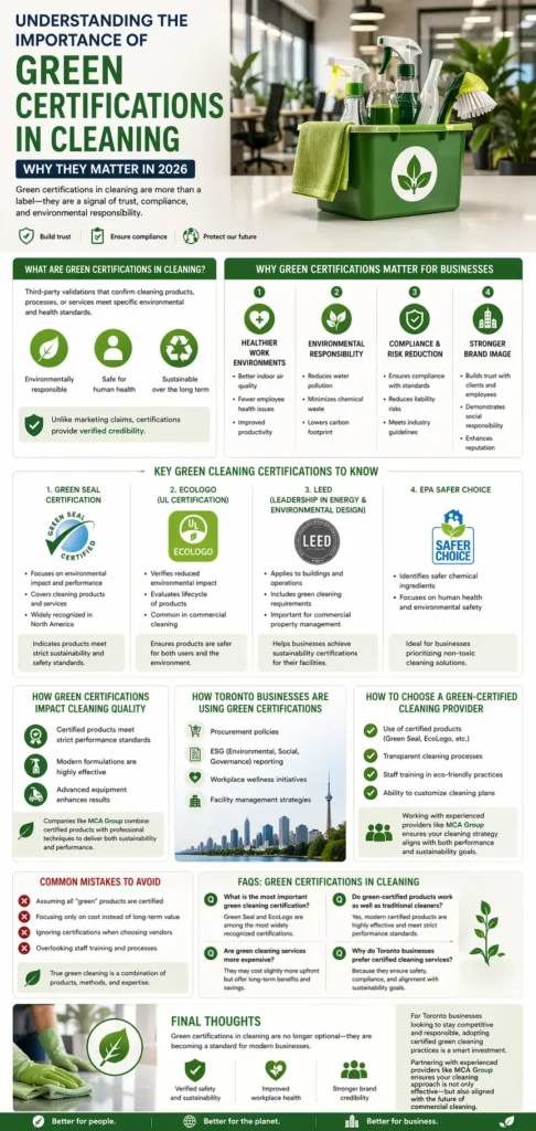 As businesses across Toronto shift toward healthier, more sustainable workplaces, green certifications in cleaning have become more than just a label they are a signal of trust, compliance, and environmental responsibility.